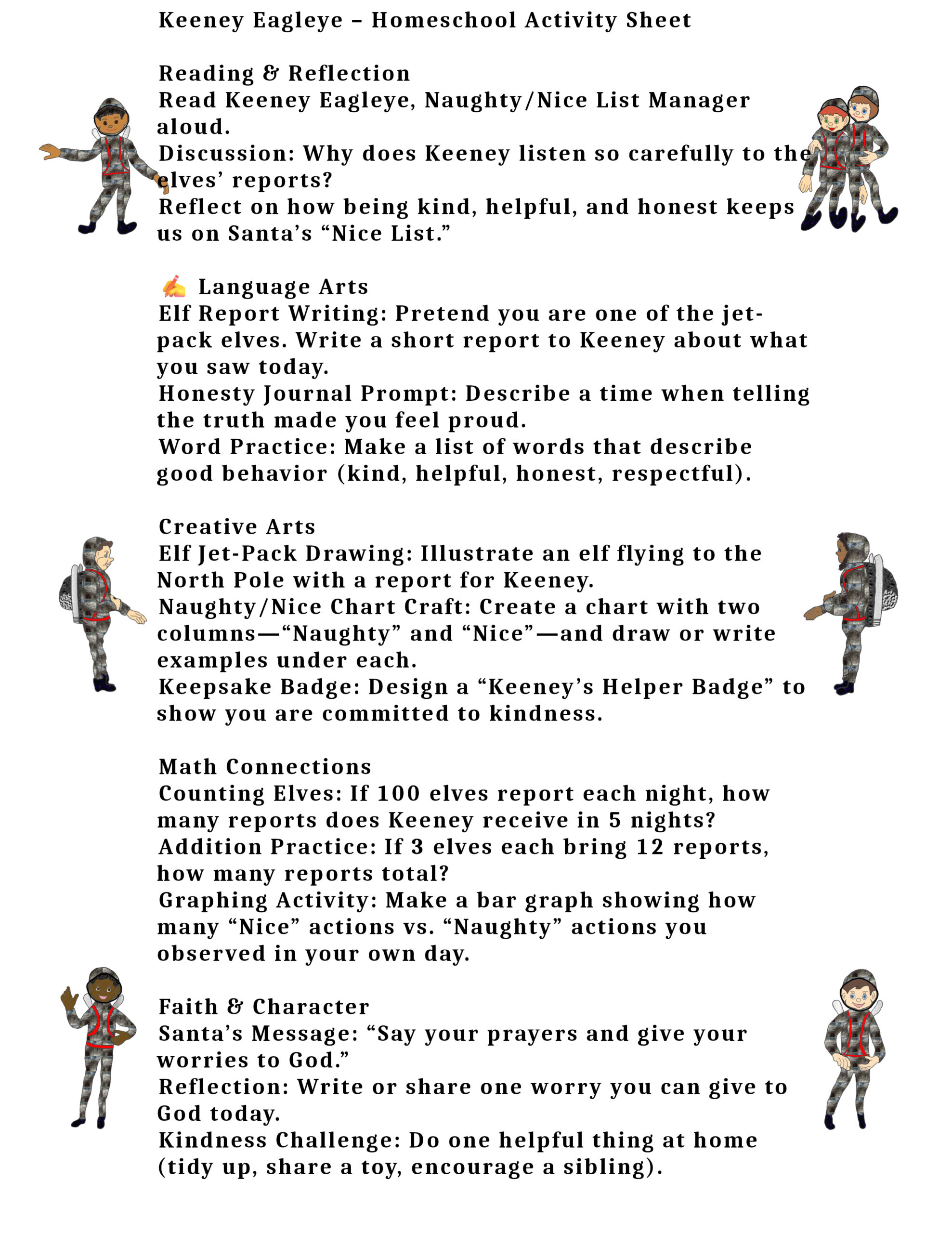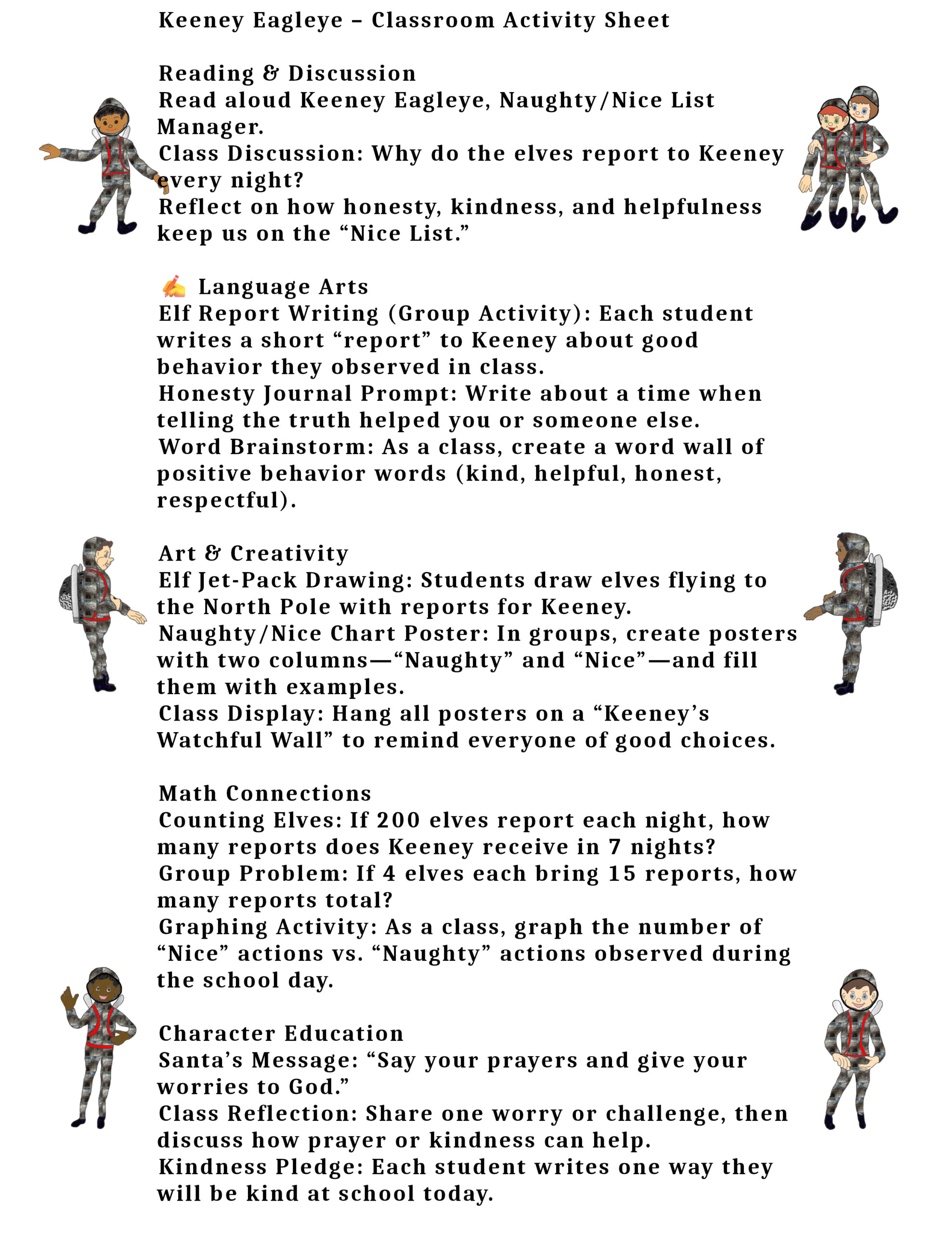 Story Overview Every night, hundreds of elves jet-pack to the North Pole to report their observations to Keeney. He listens carefully, updates the lists, and delivers them to Santa—ensuring that every child’s behavior is accounted for. Whether at home, school, or with friends, Keeney’s watchful eyes help children remember to be kind, helpful, and honest.